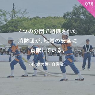 - 4つの分団で組織された消防団が、地域の安全に貢献している。[2018年3月29日]